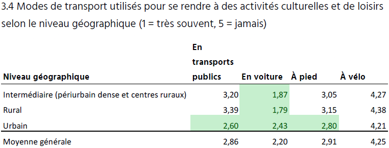 L’Observatoire romand de la culture a réalisé une enquête sur les activités des Suisses romand.es (2025). Les sorties culturelles se concentrent dans la commune de résidence et dans d’autres communes, suivies par les déplacements vers les cantons voisins. Les transports publics sont surtout utilisés par les jeunes de 15 à 24 ans, puis leur usage diminue progressivement avec l’âge. À l’inverse, la voiture est le mode de déplacement le plus courant chez les adultes entre 25 et 64 ans. La voiture est davantage utilisée en zone rurale, tandis que la marche est plus fréquente en milieu urbain***.